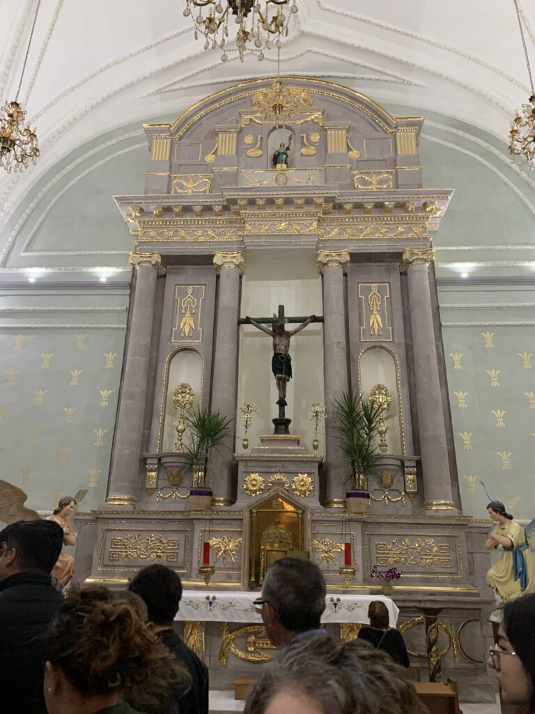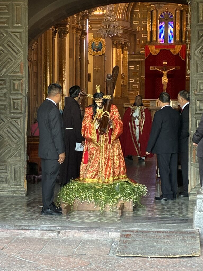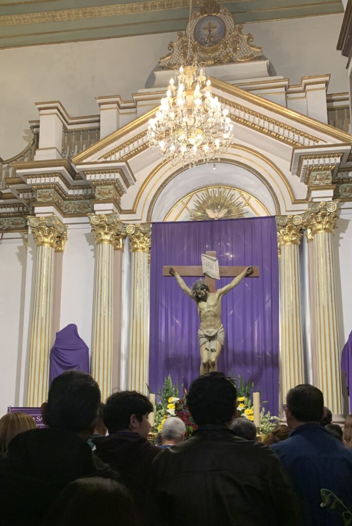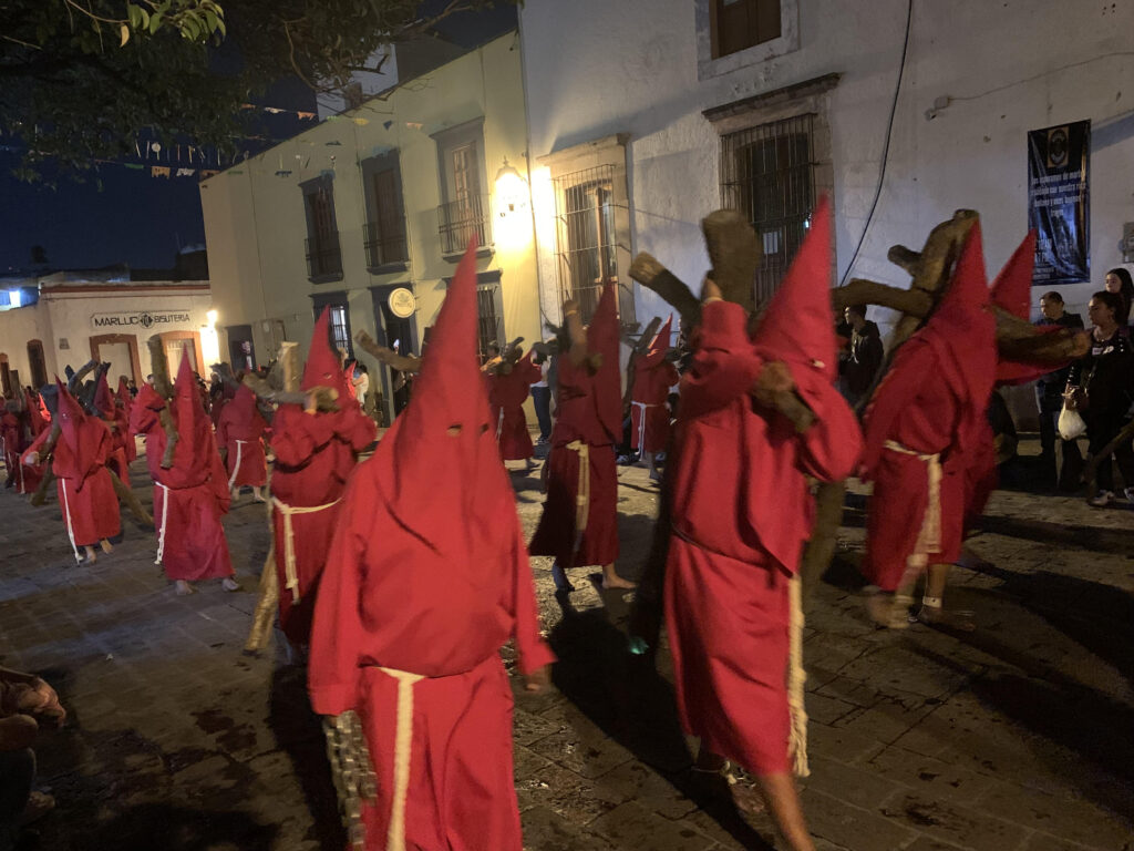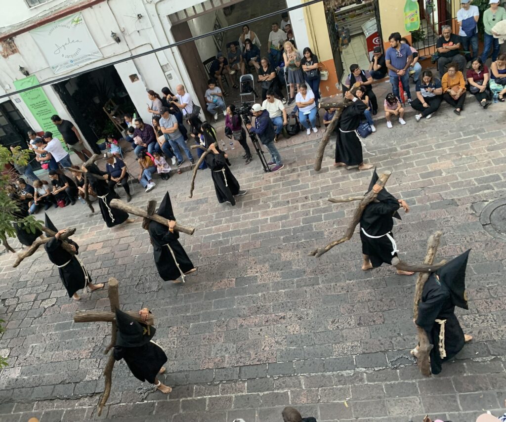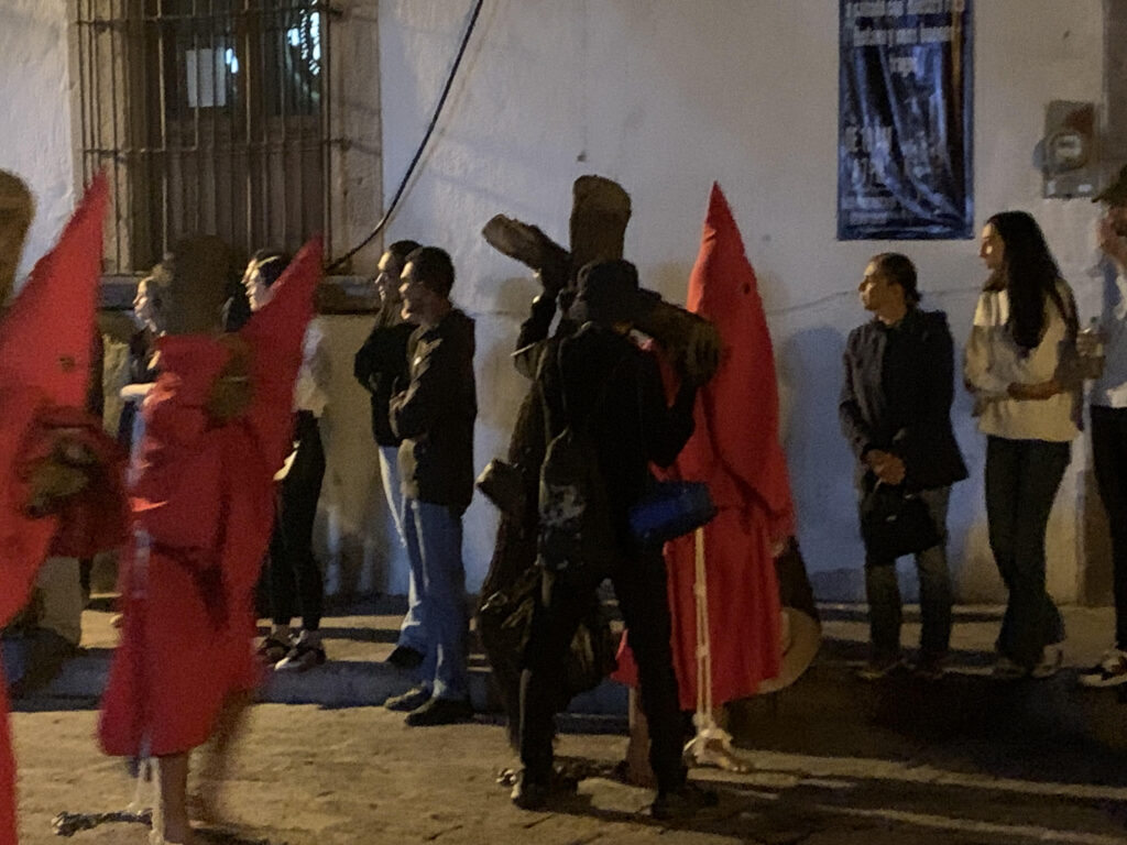 Hundreds of people carried their crosses in the street below us. It was 9:00 by the time the procession had passed. But when Tim asked us if we wanted to circle around to see the conclusion of the procession, we agreed that we did. Watching the barefoot penitents dragging their chains and crosses was deeply riveting. A helper put his hand on a penitent’s shoulder, “You are almost there. Take it slow.” He encouraged him.