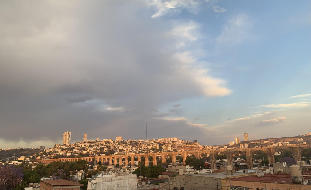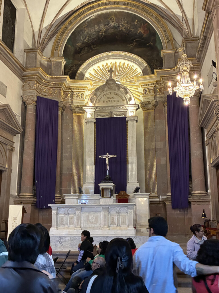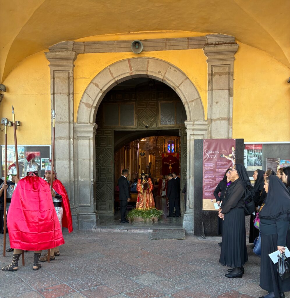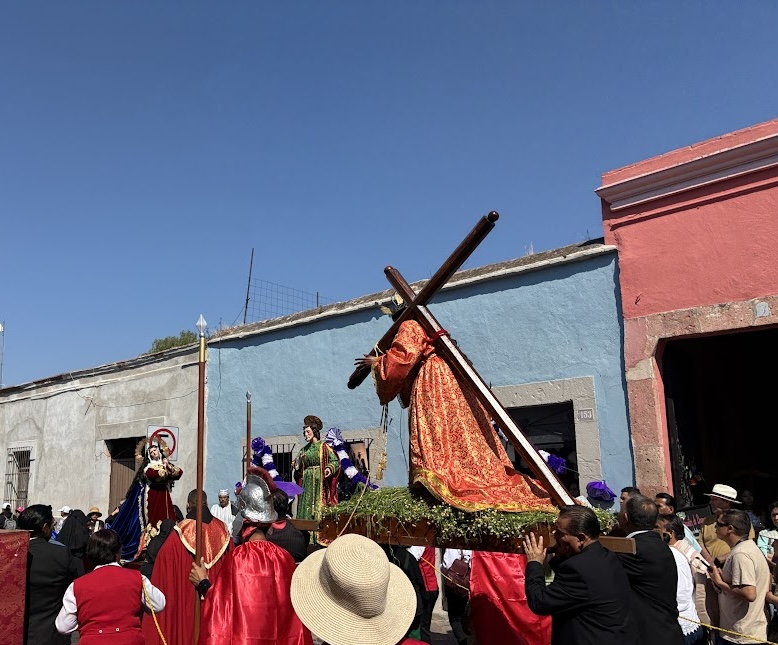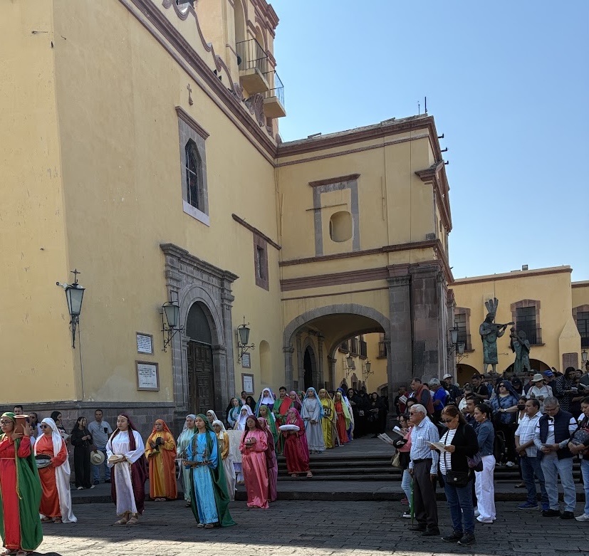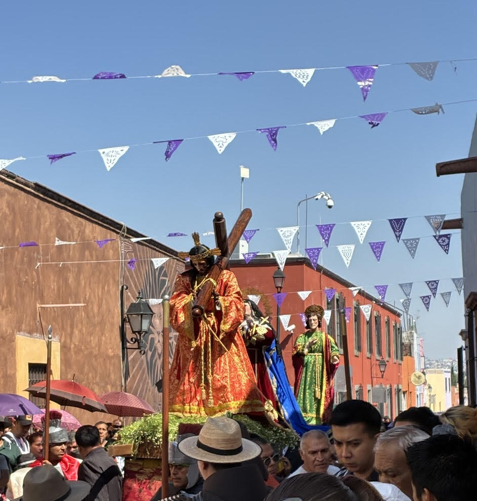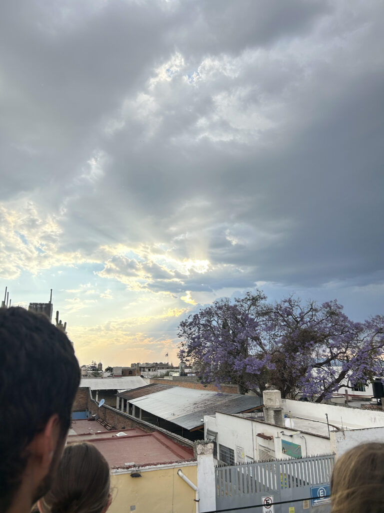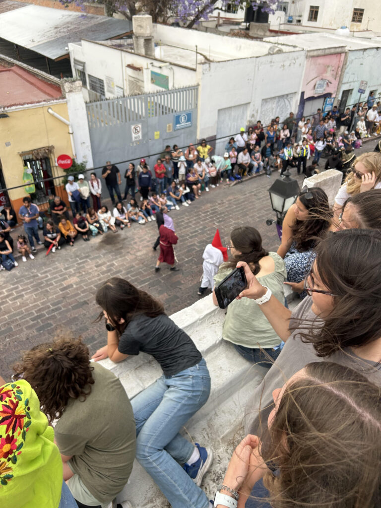 Around 4:30 in the afternoon, the streets near the Temple of San Francisco, where we had participated in the Stations of the Cross, began to fill again. Fortunately for us, Tim has keys to a building a few blocks from the temple. We climbed to the roof and were soon joined by Wheaton College students who are participating in the semester in Mexico. Below us vendors sold potato chips and drinks to the people gathered on the sidewalks. Clouds gathered above us and thunder rumbled in the distance.
