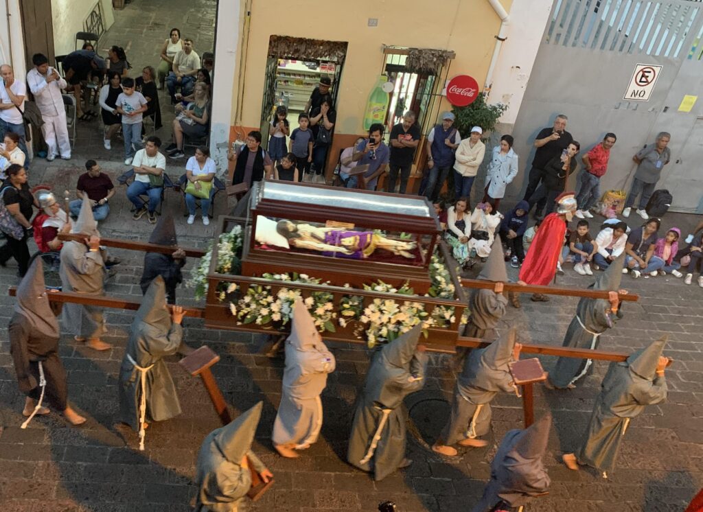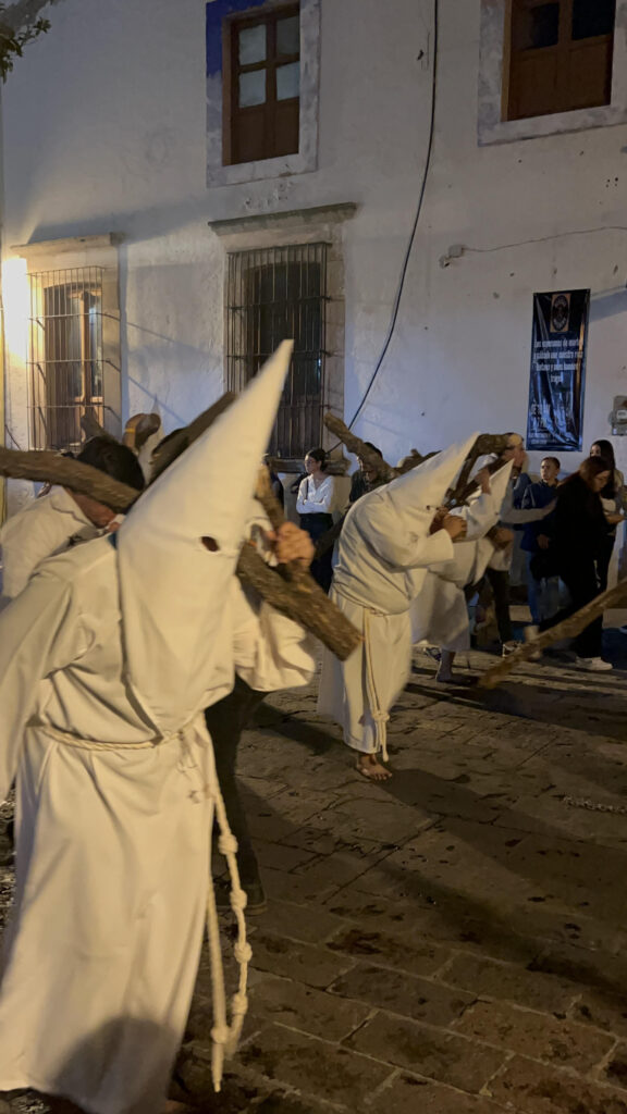 Finally, a bugle sounded from the temple. The crowds fell silent. Drums beat in the darkening sky. We watched from above as a liter carrying the figure of Jesus, his back bleeding from whip lashes, bent under a cross, was carried past by figures in white followed by women carrying the symbols of the cross and barefoot figures covered in white.