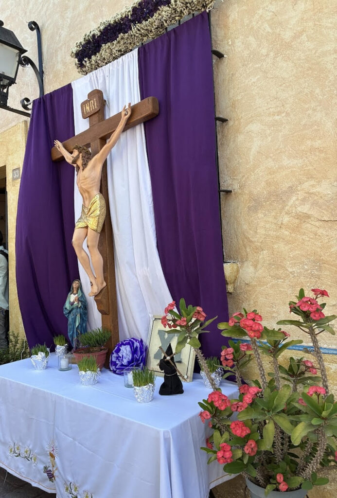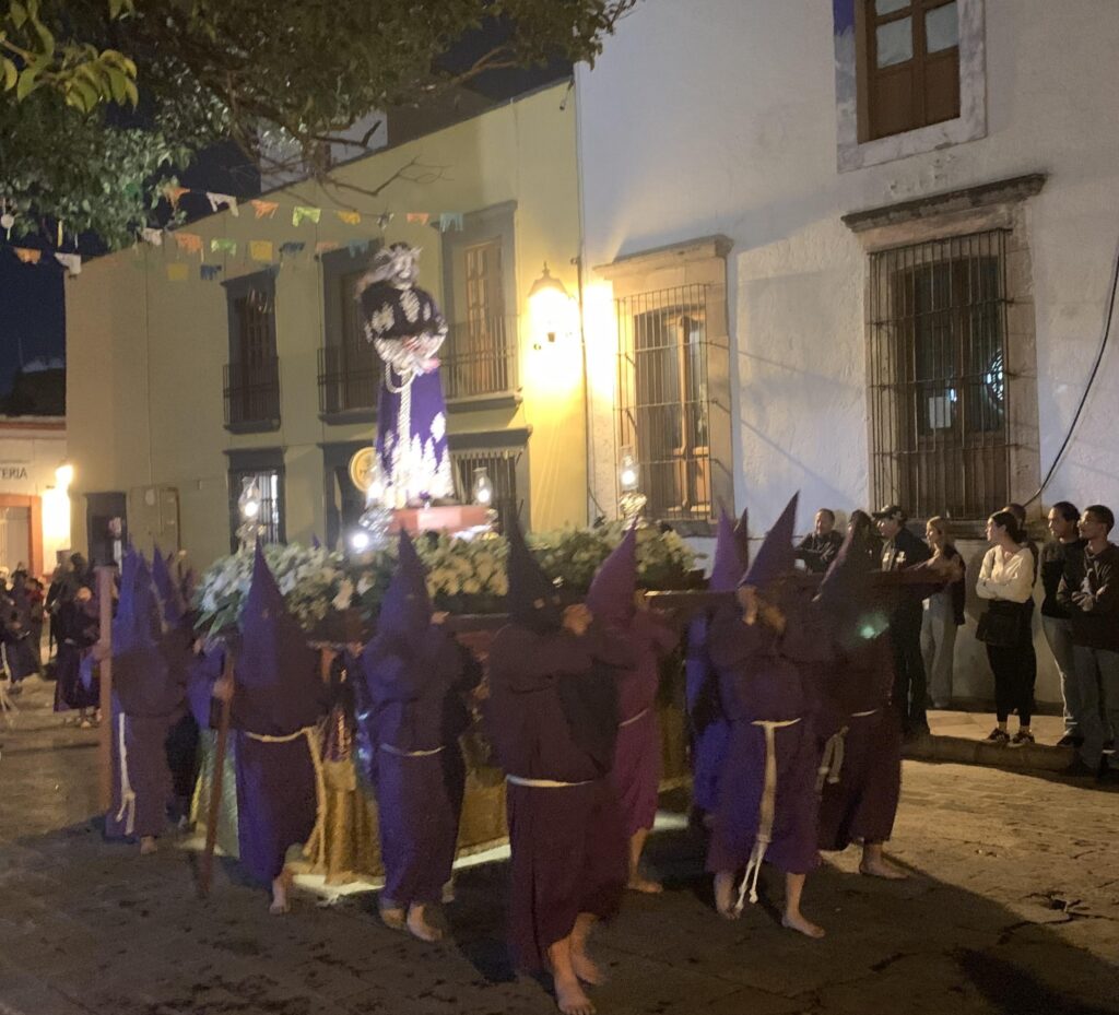 We watched a figure of Mary followed by penitents in purple habits. The drums sounded and a group of figures in red slowly processed past us. This is the first time I’ve tried to include a video, but this experience seems worth trying to share.